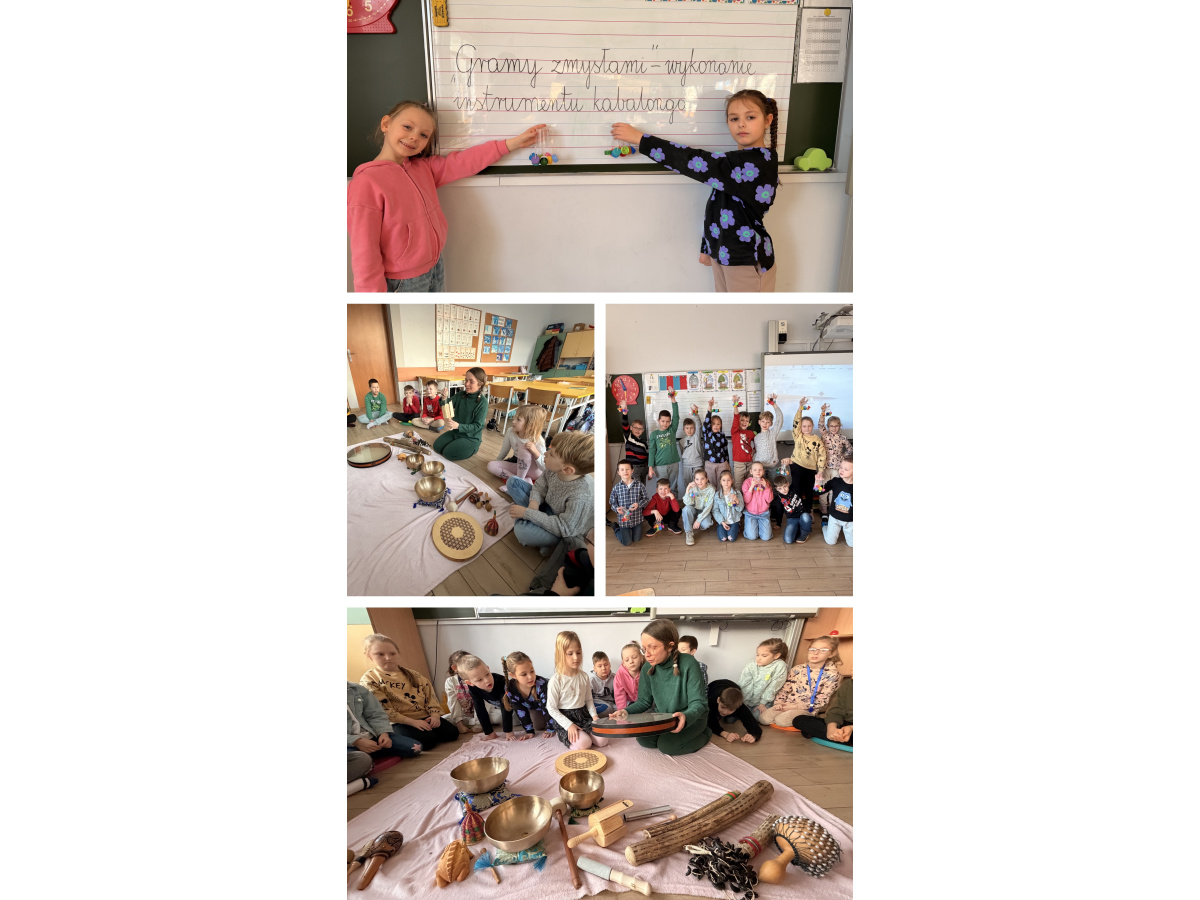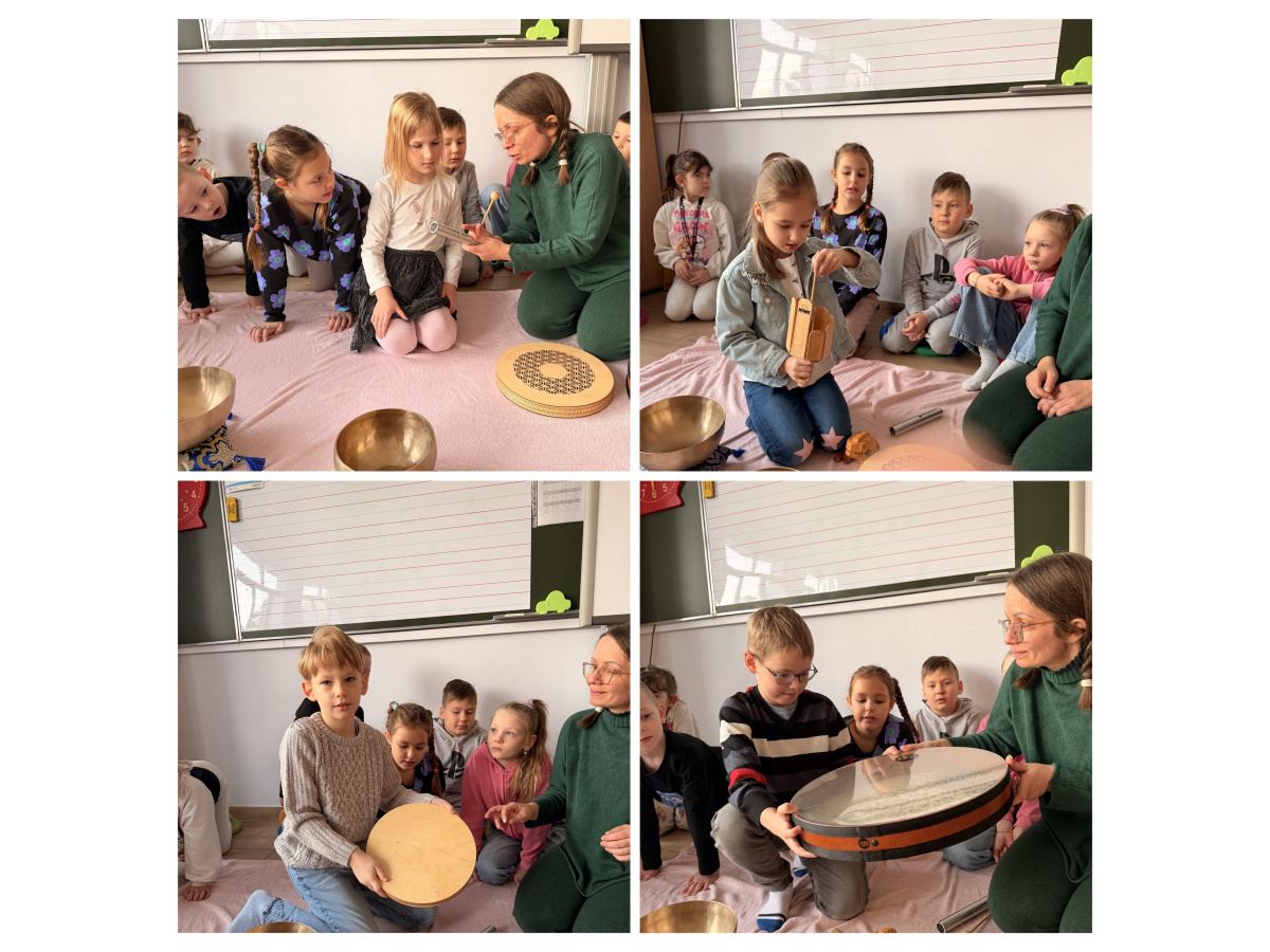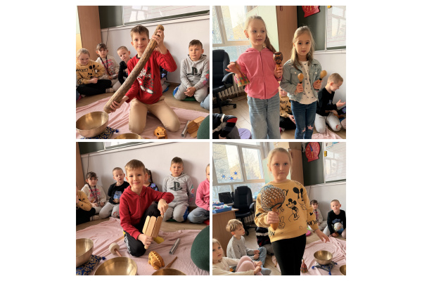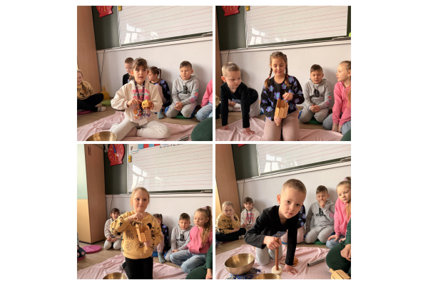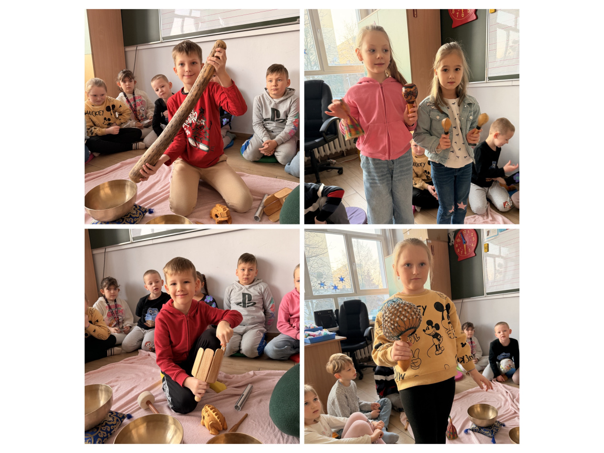 W ramach realizowanego w klasie 1b projektu „Gramy zmysłami” uczniowie tym razem skupili się na zmyśle słuchu. Podczas zajęć dzieci miały okazję poznać wiele nietypowych instrumentów, takich jak misy tybetańskie, bęben oceaniczny, kije deszczowe, tuba wha wha, kabalonga i inne. Mogły również samodzielnie spróbować gry, eksperymentując z dźwiękami i odkrywając, w jaki sposób one powstają. Kolejnym etapem było tworzenie własnej ekologicznej kabalongi. Uczniowie z dużym zaangażowaniem brali udział w zajęciach, rozwijając kreatywność, sprawność manualną oraz wyobraźnię. Brawo 1b!