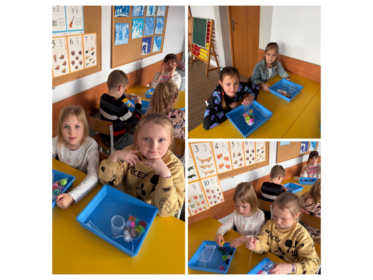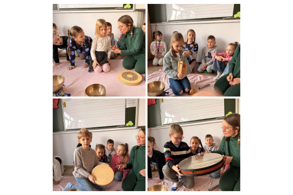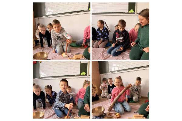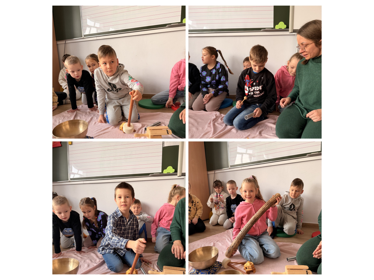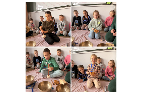 W ramach realizowanego w klasie 1b projektu „Gramy zmysłami” uczniowie tym razem skupili się na zmyśle słuchu. Podczas zajęć dzieci miały okazję poznać wiele nietypowych instrumentów, takich jak misy tybetańskie, bęben oceaniczny, kije deszczowe, tuba wha wha, kabalonga i inne. Mogły również samodzielnie spróbować gry, eksperymentując z dźwiękami i odkrywając, w jaki sposób one powstają. Kolejnym etapem było tworzenie własnej ekologicznej kabalongi. Uczniowie z dużym zaangażowaniem brali udział w zajęciach, rozwijając kreatywność, sprawność manualną oraz wyobraźnię. Brawo 1b!