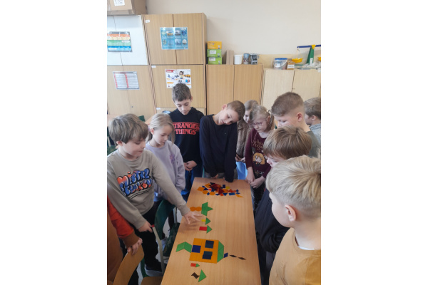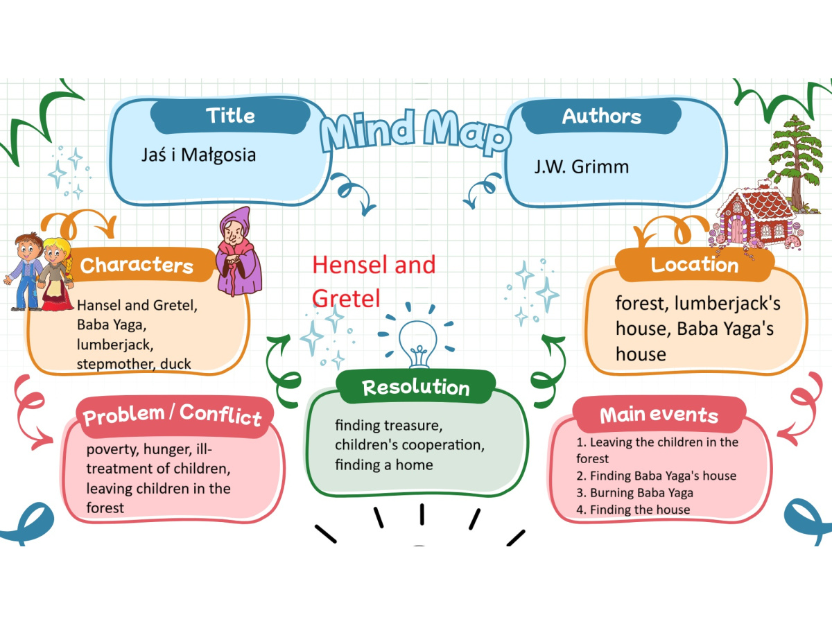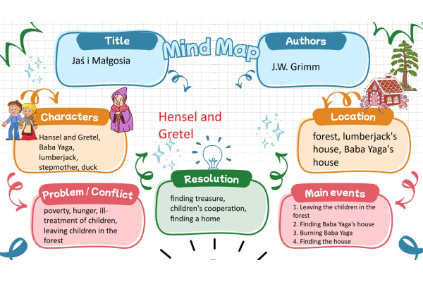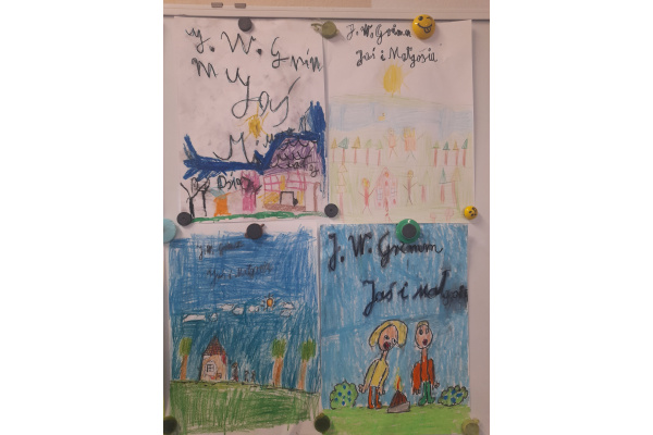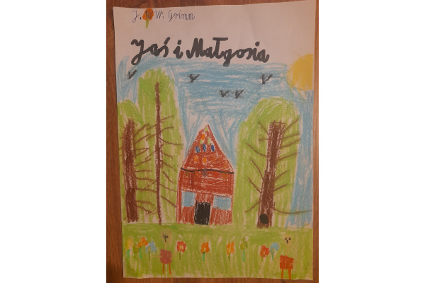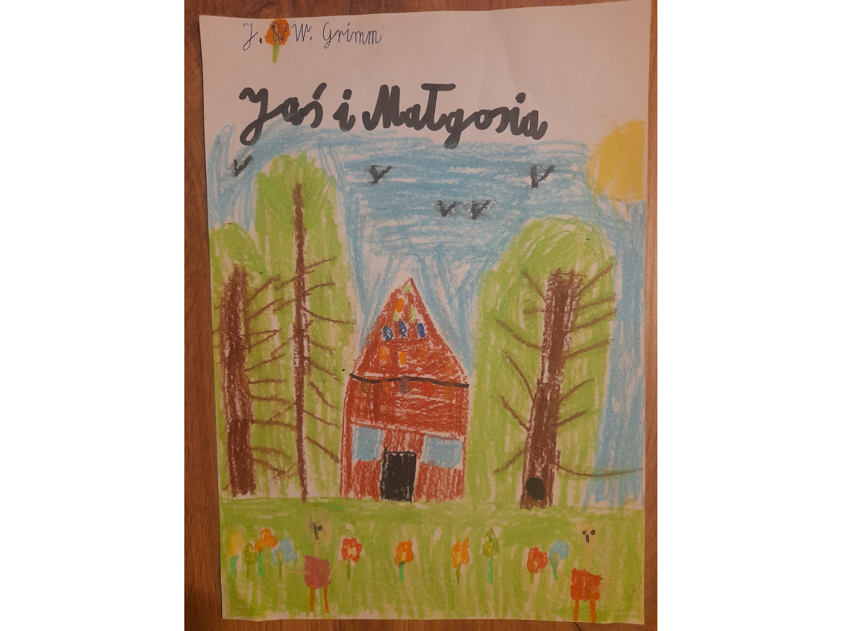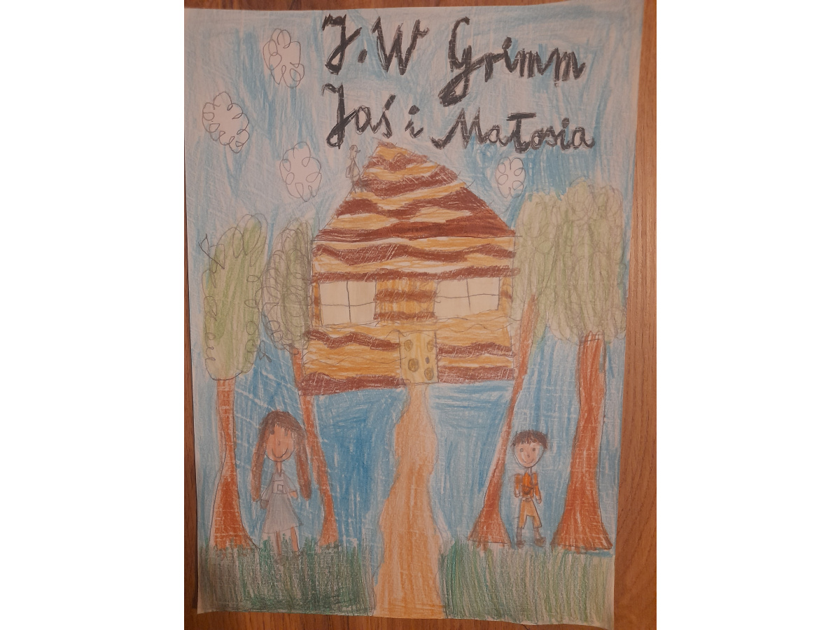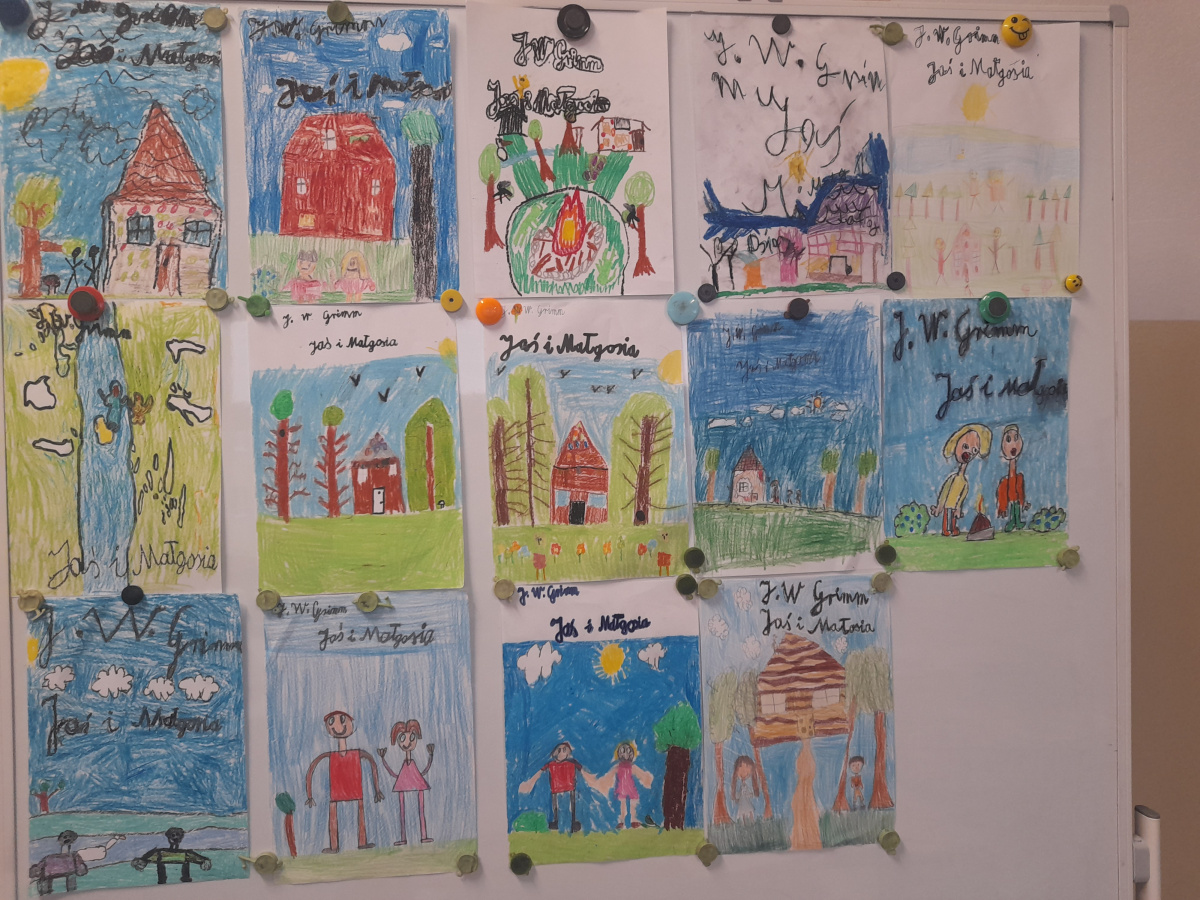 Dzieci z klasy 2b biorą także udział w projekcie międzynarodowym "Little Readers, Great Classics" (Mali czytelnicy, wspaniałe klasyki) we współpracy ze szkołami z Turcji, Rumunii i Portugalii, który polega na comiesięcznym czytaniu oraz opracowaniu wybranej lektury spośród klasyków literatury dla dzieci. W poprzednim miesiącu dzieci realizowały tematy związane z bajką braci Grimm "Jaś i Małgosia" - tworzyły mapę mentalną lektury i okładki do książki, pisały streszczenie, tworzyły geometryczne obrazy nawiązujące do bajki oraz bawiły się po angielsku w zabawę "Raz, dwa, trzy - Baga Jaga patrzy". Poniżej streszczenie bajki ułożone przez dzieci: